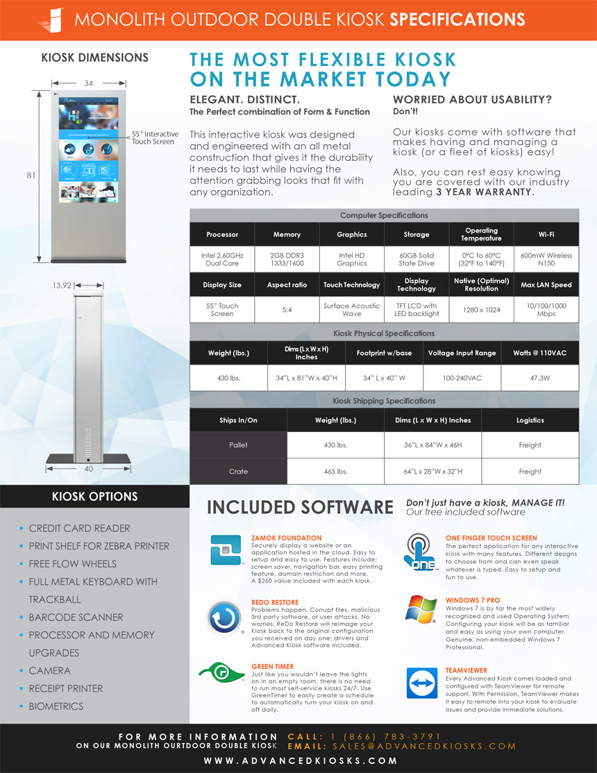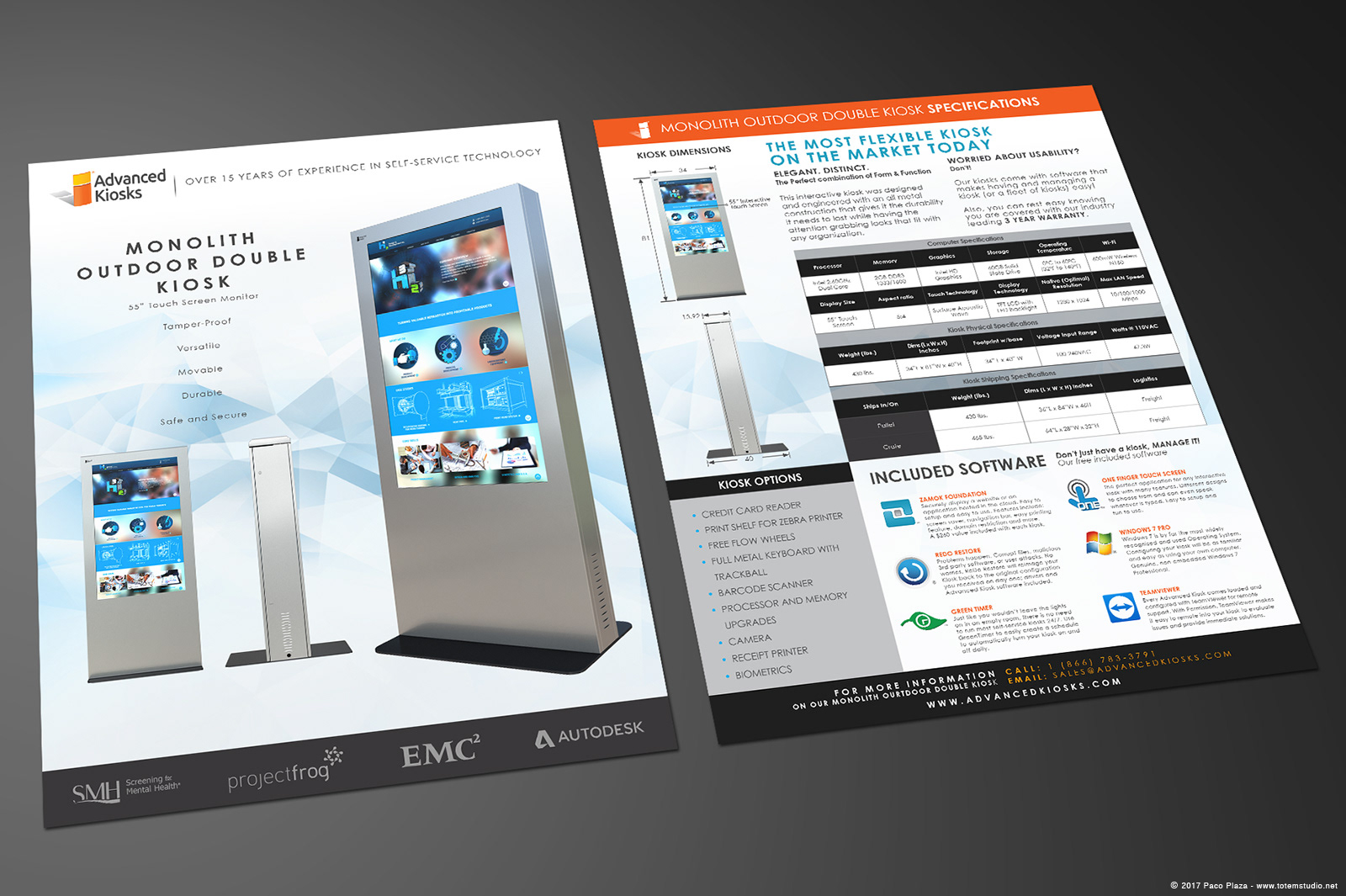 Interactive kiosk brochure page layout, graphic design and product photo-realistic illustration. Client: Advanced Kiosks Art Direction/Graphic Design/3D CGI: Paco Plaza