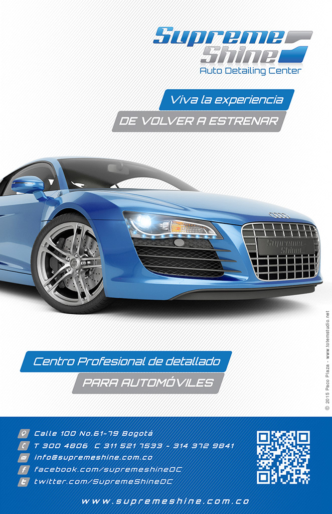 Car Detailing Center Branding and 3D CGI rendering as part of the company web site, posters, magazine ad, and large format prints (Facade Window & Billboard) visual identity. Client: Supreme Shine Art Direction/3D CGI: Paco Plaza