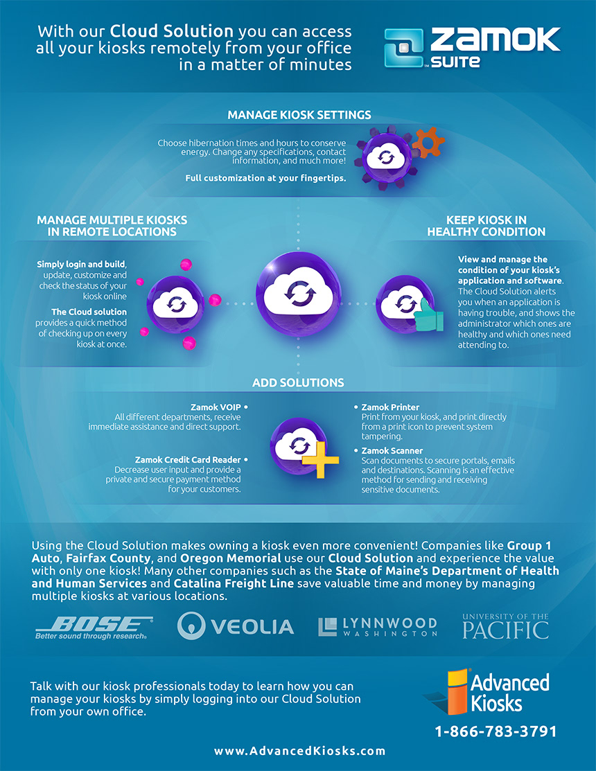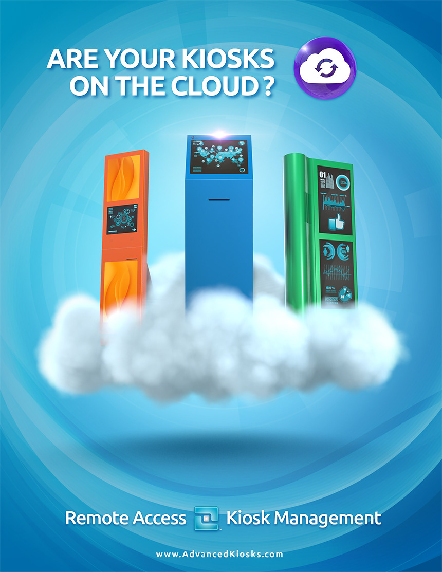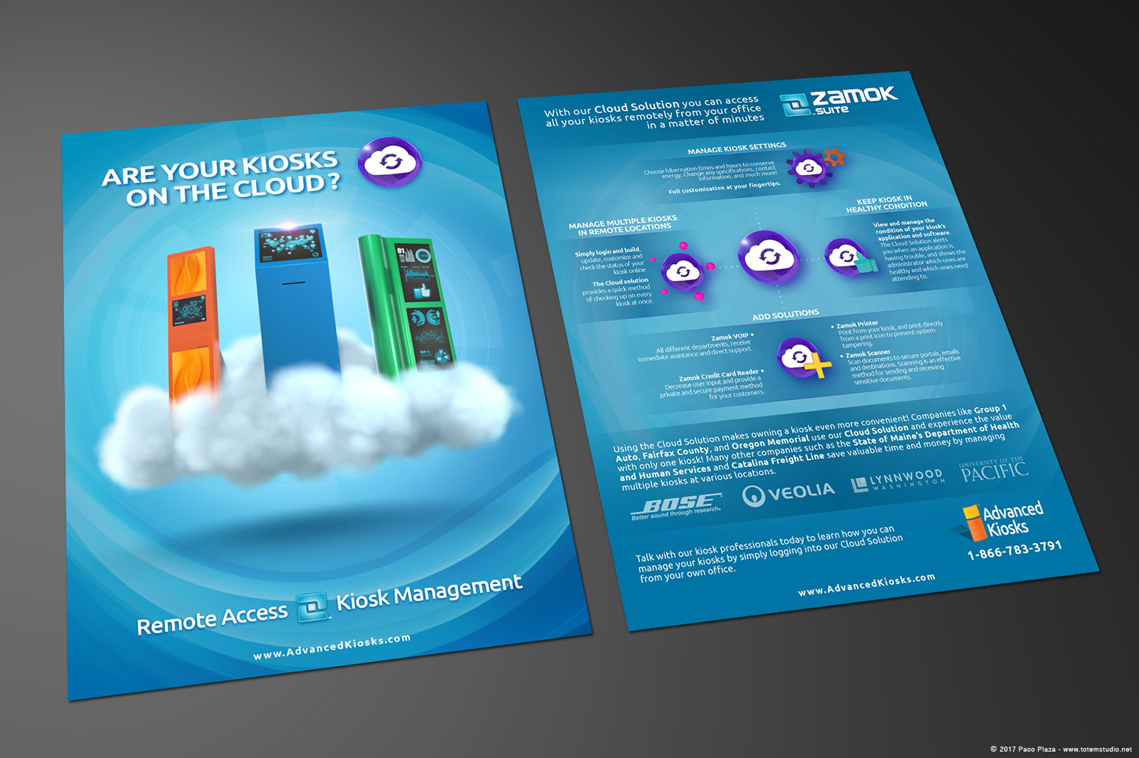 Cloud software logo, brochure page layout, graphic design and cover 3d artwork. Client: Advanced Kiosks Art Direction/Graphic Design/3D CGI cover artwork: Paco Plaza